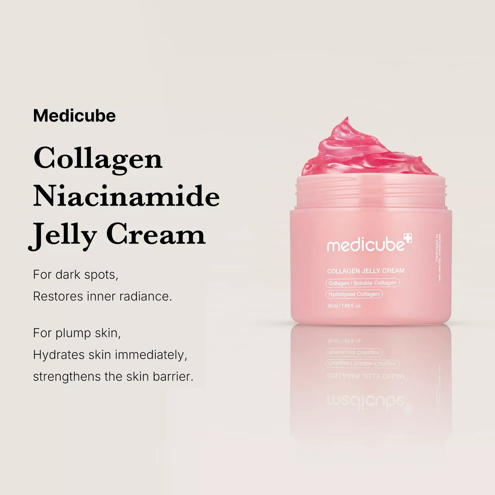 Medicube Collagen Jelly Cream combines freeze-dried hydrolyzed collagen with niacinamide to deliver intense hydration, visible firming, and a radiant 24-hour glow. This unique jelly texture melts into skin for a plump, lifted appearance.